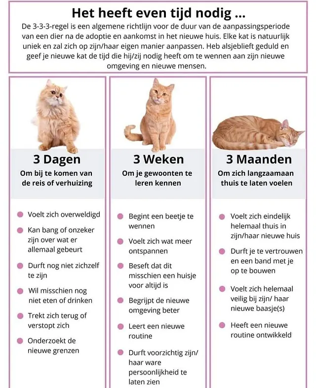 Hou dan de 3-3-3-regel goed in gedachten. De meeste adoptiekatten hebben al veel meegemaakt in hun leventje. Geef ze de tijd om te wennen aan alle nieuwe indrukken.